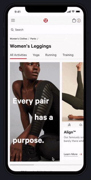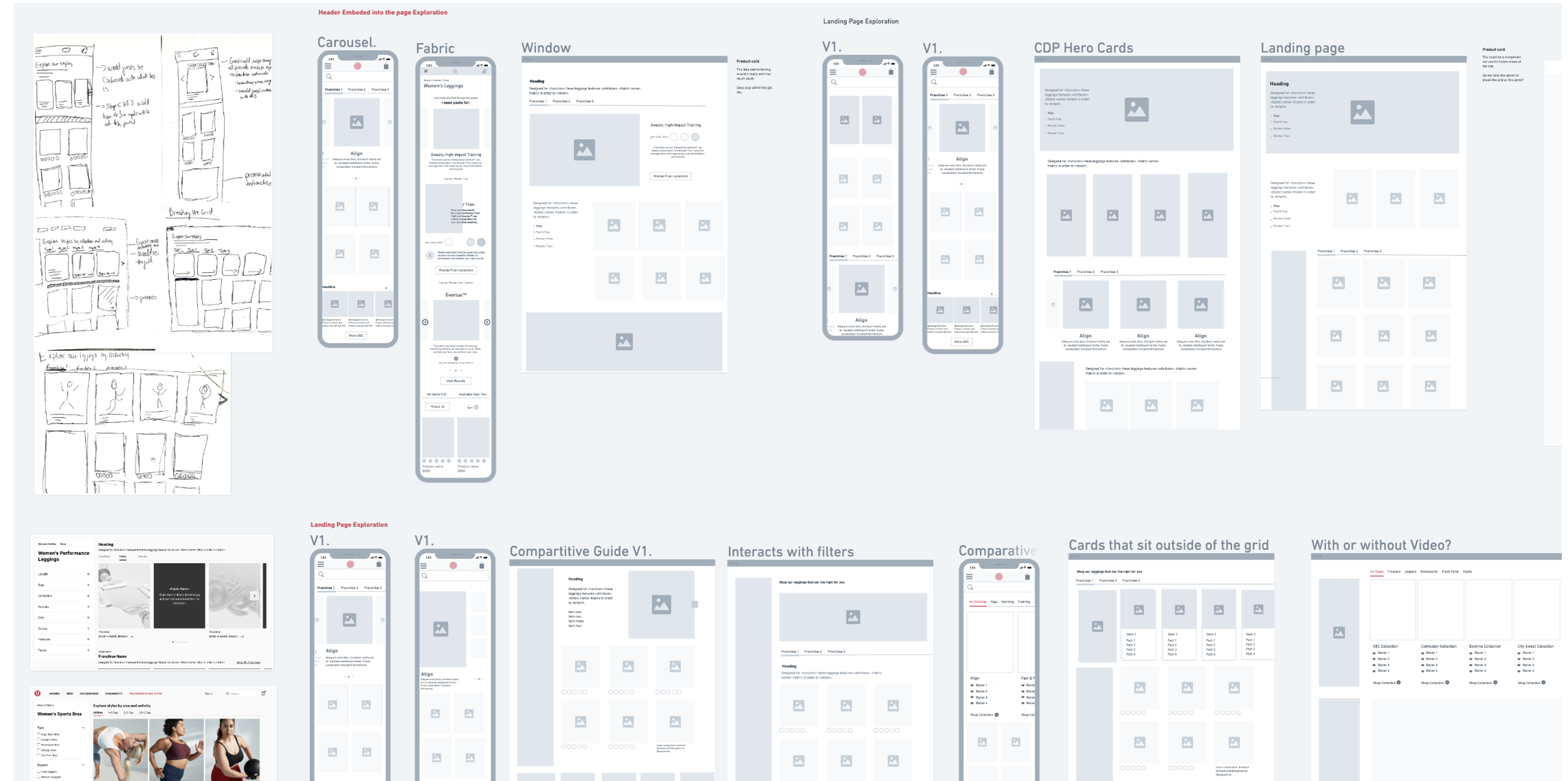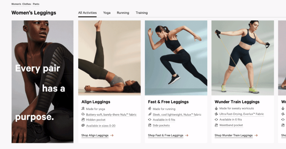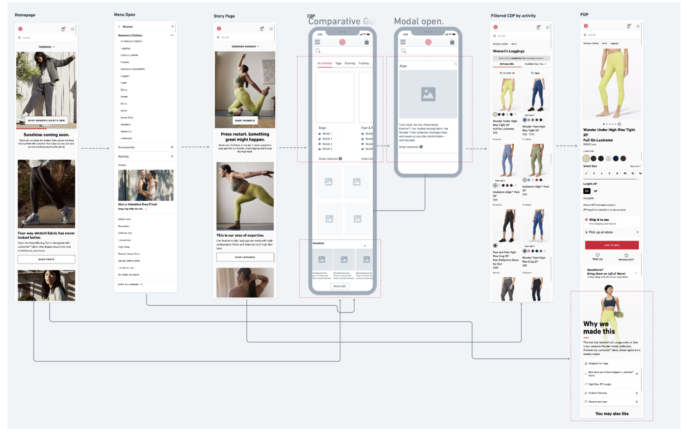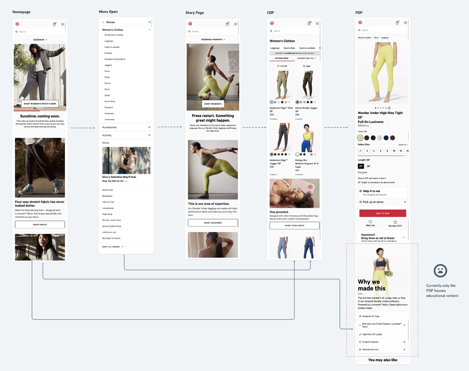 Our existing flow showed that the only product education we provide on leggings is currently located on PDPs. The is 3 clicks into the user journey just for any education. CDP promo tiles do have some education but mostly marketing material.